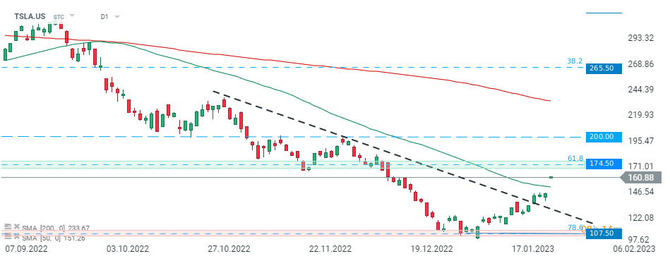 Il titolo Tesla (TSLA.US) ha superato la linea di tendenza al rialzo all'inizio della settimana e nuovi risultati trimestrali forniscono una spinta rialzista. Il titolo ha iniziato la sessione odierna con un gap di prezzo ribassista e si sta muovendo verso un'importante resistenza a 174,50 dollari, che coincide con il 61,8% del ritracciamento di Fibonacci dell'impulso al rialzo iniziato all'inizio della pandemia. Fonte: xStation5