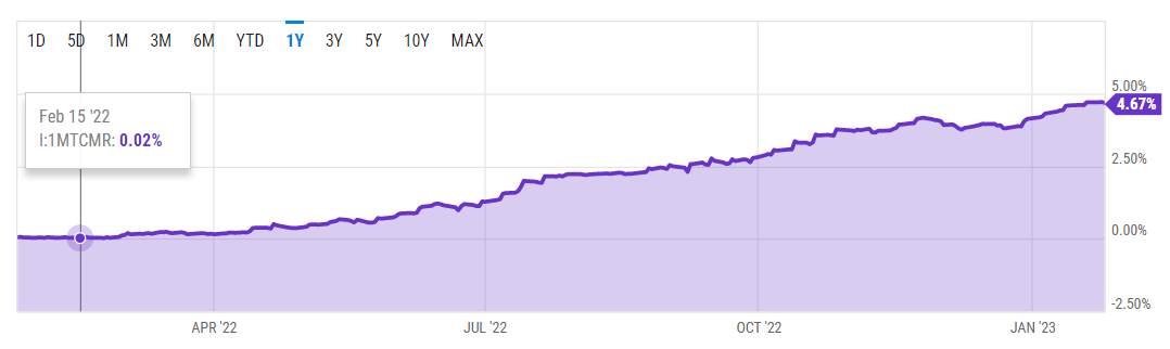 Il Buono del Tesoro a 1 mese è recentemente salito al 4,69%, che è il rendimento mensile più alto dall'agosto 2007, a causa del rallentamento dell'inflazione. Ciò dimostra anche che il mercato ora si aspetta che la Fed aumenti di soli 25 punti base la prossima settimana. Fonte: Ycharts