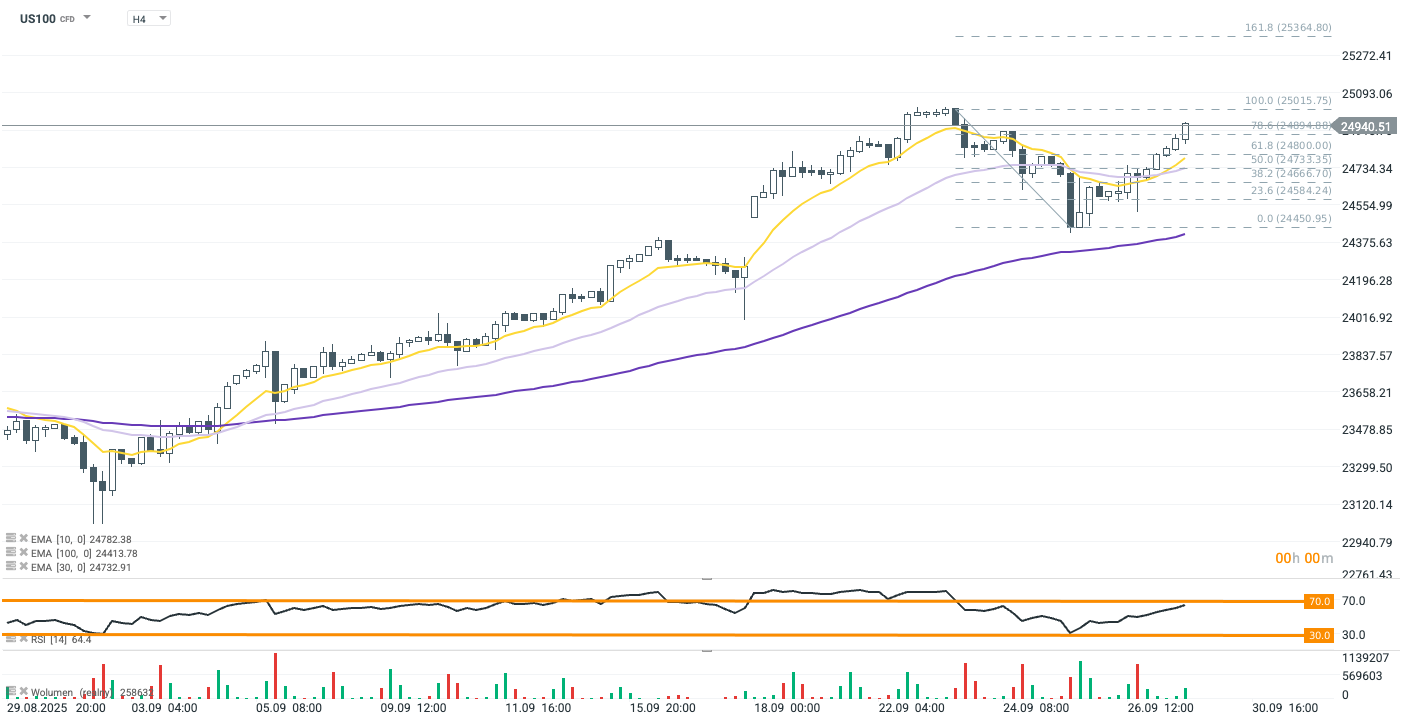 I futures sul Nasdaq 100 hanno superato la media mobile esponenziale a 10 periodi (EMA10, gialla) nelle prime ore della sessione odierna, spingendosi oltre il livello di 24.900. Se il prezzo rimane al di sopra del ritracciamento di Fibonacci al 78,6%, l’US100 potrebbe continuare la salita verso i recenti massimi storici e potenzialmente segnare nuovi record. Tuttavia, i timori riguardo alla tempistica del prossimo rapporto sull’occupazione, in un contesto di possibile shutdown del governo, potrebbero innescare un ritracciamento verso la EMA30 (viola chiaro).