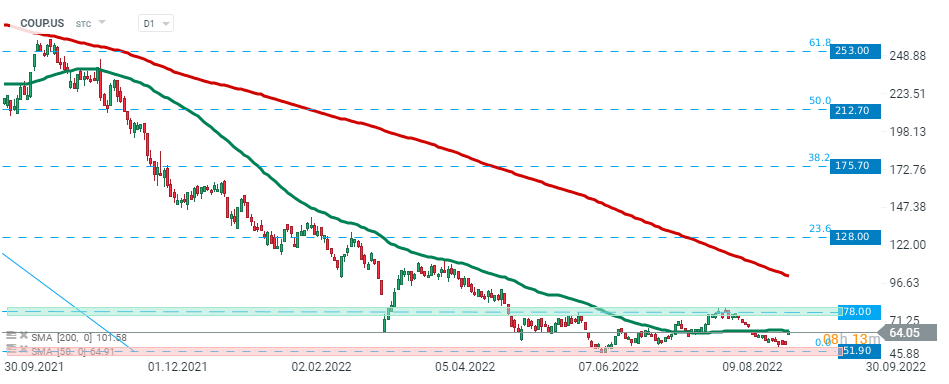 Il titolo Coupa Software (COUP.US) è sceso di oltre l'85,0% dai massimi di febbraio 2021 e ha trovato supporto a circa $ 51,90. Finché il prezzo rimane al di sopra di questo livello, potrebbe essere lanciato un impulso al rialzo verso la resistenza locale a $ 78,00. Fonte: xStation5