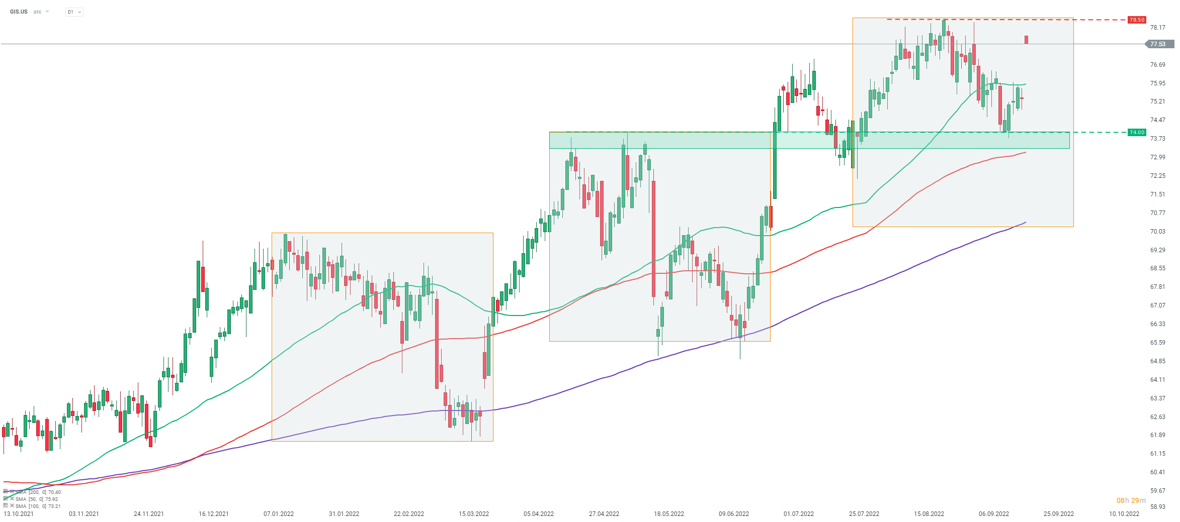 Le azioni di General Mills (GIS.US) hanno iniziato la sessione di trading odierna con un gap di prezzo rialzista, dopo l'aggiornamento alle previsioni per l'anno fiscale 2023. Il titolo è riuscito a fermare la recente correzione al ribasso nella zona di supporto sotto i $ 74. Dopo il movimento di oggi, il titolo è tornato al di sopra della media mobile a 50 sessioni (linea verde) e si avvicina ai massimi recenti nell'area di $ 78,50. Fonte: xStation5