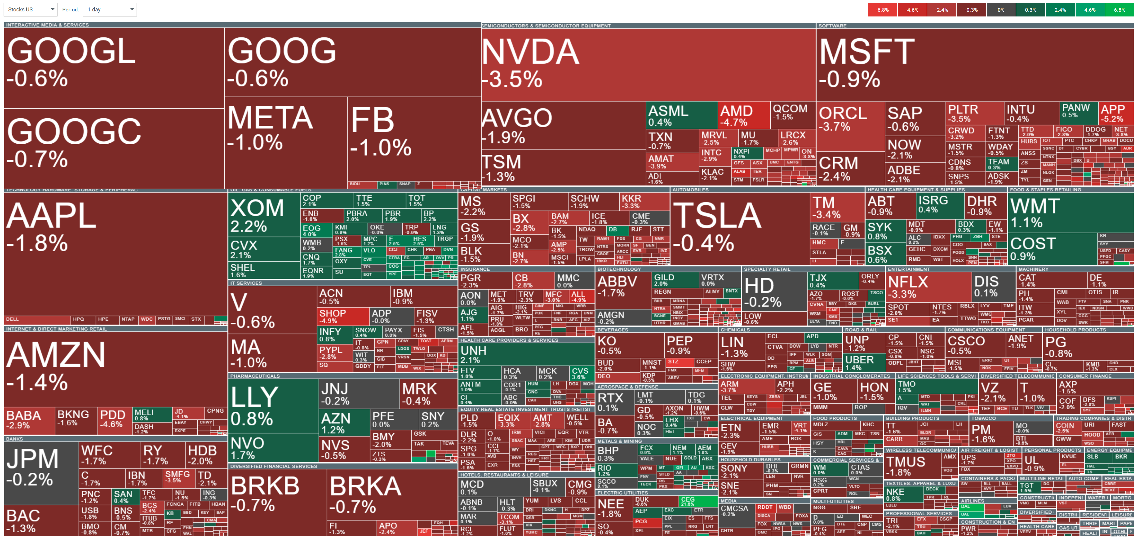 Settori S&P 500 prevalentemente rossi: il mercato mostra un’ampia debolezza con la maggior parte dei settori in calo. Energia e servizi di pubblica utilità sono gli unici punti positivi, in crescita rispettivamente dell'1,44% e dello 0,63%, insieme a un modesto guadagno nel settore sanitario (+0,26%). L'informatica guida la flessione (-1,79%), seguita dal settore immobiliare (-1,44%) e dalla finanza (-1,28%). L'indice S&P 500 complessivo è in calo del -0,90%.
