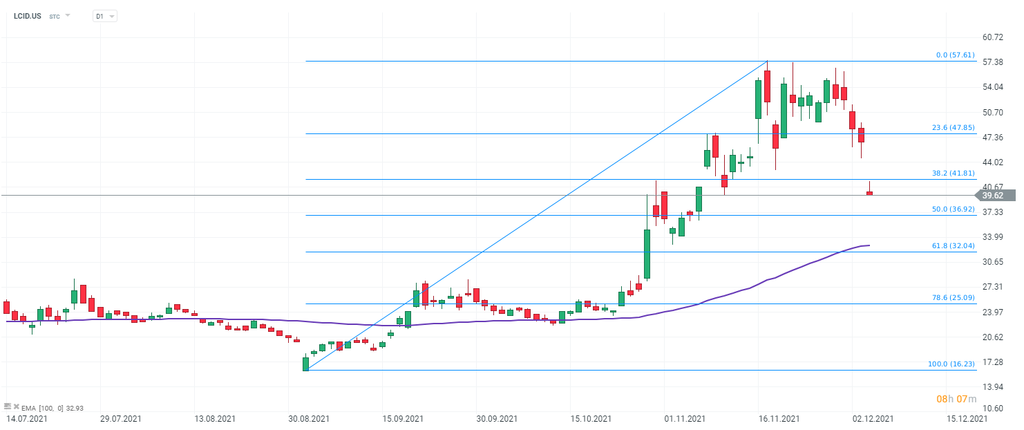 Le azioni della società hanno iniziato la sessione di oggi con un gap di prezzo al ribasso, che ha superato il 50% del ritracciamento di Fibonacci, a un livello di 41,8 dollari. Il prossimo importante supporto per le quotazioni dell'azienda sarà la zona tra i ritracciamenti del 50% e del 61,8%, rafforzata dalla 100 EMA (linea viola). Fonte: xStation 5