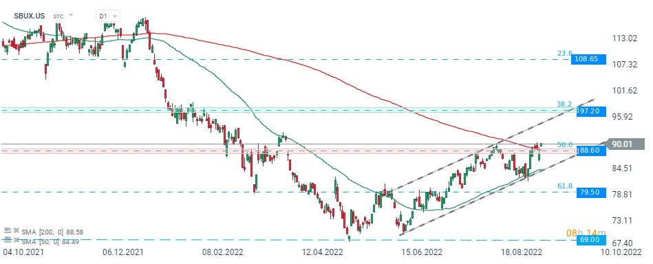 Il titolo Starbucks (SBUX.US) ha iniziato la sessione odierna con un gap di prezzo rialzista e al di sopra della resistenza a $ 88,60, che coincide con il 50,0% del ritracciamento di Fibonacci dell'ondata al rialzo iniziata a marzo 2020. Finché il prezzo rimane al di sopra, il movimento al rialzo potrebbe accelerare verso la prossima resistenza a 97,20$ che è contrassegnata da precedenti reazioni al prezzo, 38,6% del ritracciamento e limite superiore del canale ascendente. Fonte: xStation5