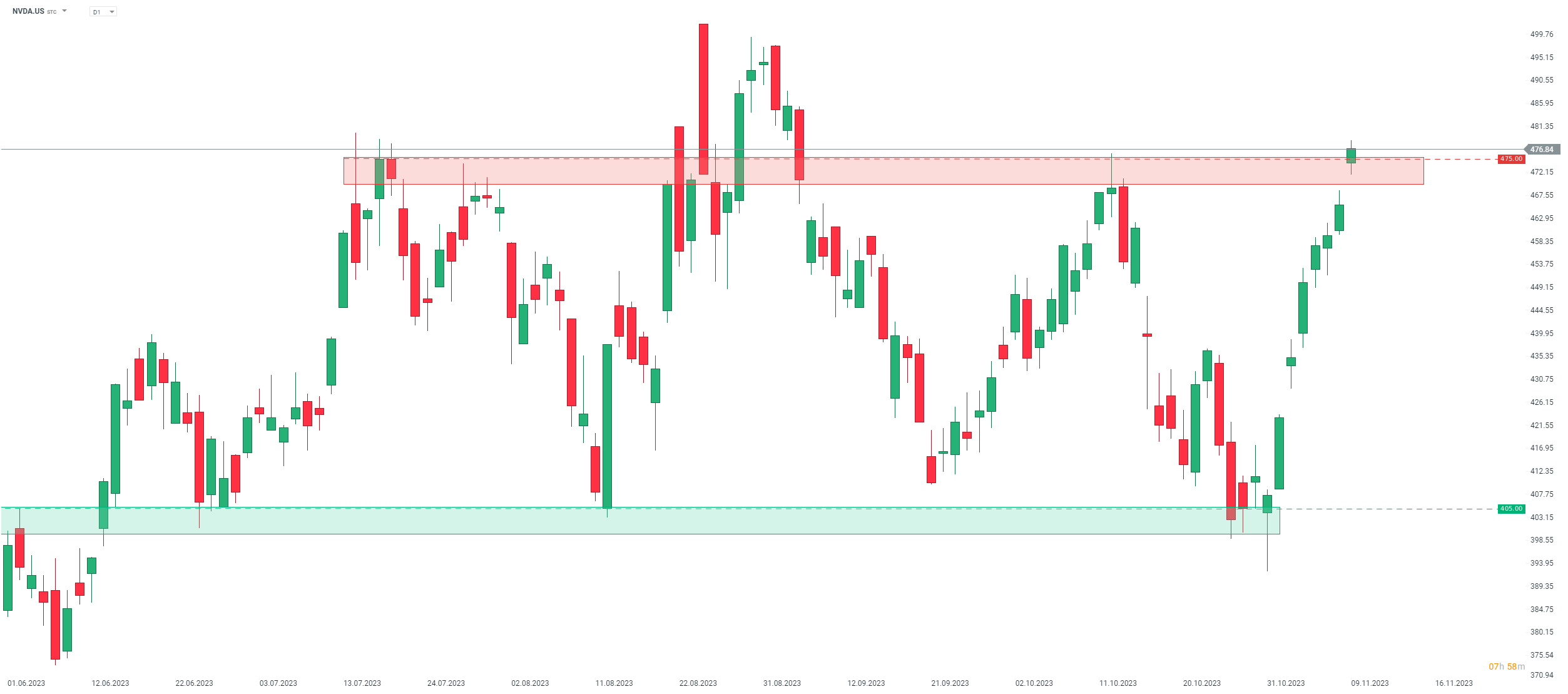 Nvidia (NVDA.US) ha lanciato le contrattazioni di oggi in rialzo in seguito alle notizie dei media sui nuovi chip AI per le aziende cinesi. Le azioni stanno tentando di superare la zona di resistenza di $ 475, che funge da limite superiore di un recente intervallo di trading. Un range da manuale per il breakout da questo intervallo è di circa 70$. Fonte: xStation5