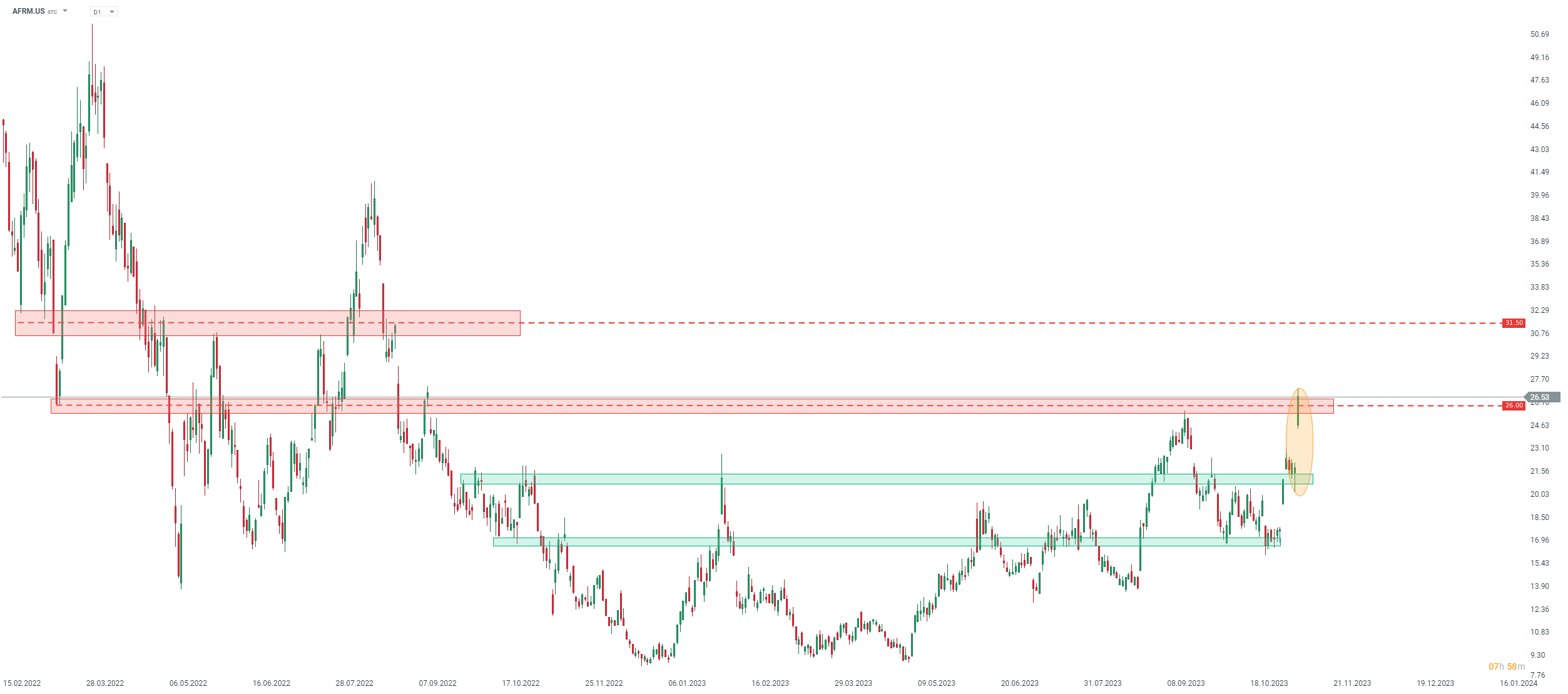 Affirm Holdings (AFRM.US) ha lanciato le negoziazioni di oggi con un grande gap di prezzo rialzista e ha continuato a guadagnare durante la sessione. Il solido rapporto sugli utili fiscali del primo trimestre ha spinto il titolo al di sopra dei massimi di settembre 2023 e al livello più alto da metà settembre 2022. Al momento della stesura di questo articolo, la zona di resistenza attorno alla soglia dei 26 dollari è in fase di test. Fonte: xStation5