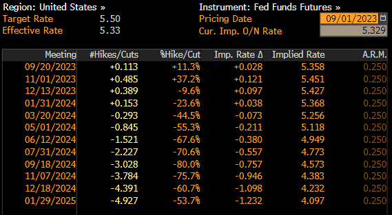 Sebbene la Fed non abbia escluso un rialzo dei tassi alla riunione di settembre, i mercati sembrano aver perso le speranze in merito alla luce dei dati recenti. I prezzi di mercato hanno solo una probabilità dell'11% di un aumento dei tassi di 25 punti base alla riunione di settembre. Inoltre, i mercati monetari non sono sicuri se la Fed alzerà nuovamente i tassi quest’anno, con un prezzo cumulativo per la riunione di novembre di soli 12 punti base per l’inasprimento. La delusione nei dati statunitensi ha anche anticipato la fissazione dei prezzi del primo taglio dei tassi: i mercati ora si aspettano che la Fed inizi a tagliare i tassi nel maggio 2024.
