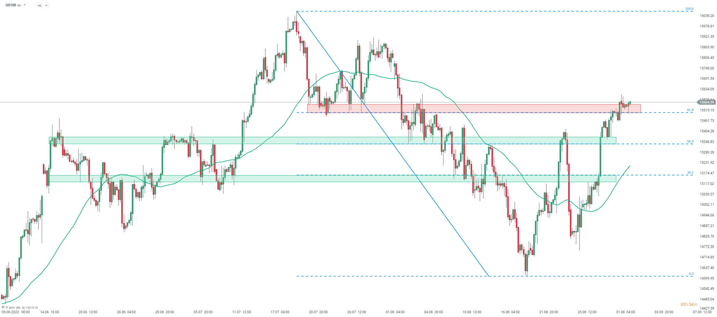 I futures Nasdaq-100 (US100) sono saliti negli ultimi giorni. L’indice è salito al livello più alto in quasi 4 settimane e sta tentando di superare la zona di resistenza contrassegnata da un ritracciamento del 61,8% dell’impulso al ribasso lanciato il 19 luglio 2023. Il dato debole dei dati NFP di oggi probabilmente consoliderebbe le aspettative del mercato per un no rialzo e innescare una reazione accomodante: guadagni sugli indici.