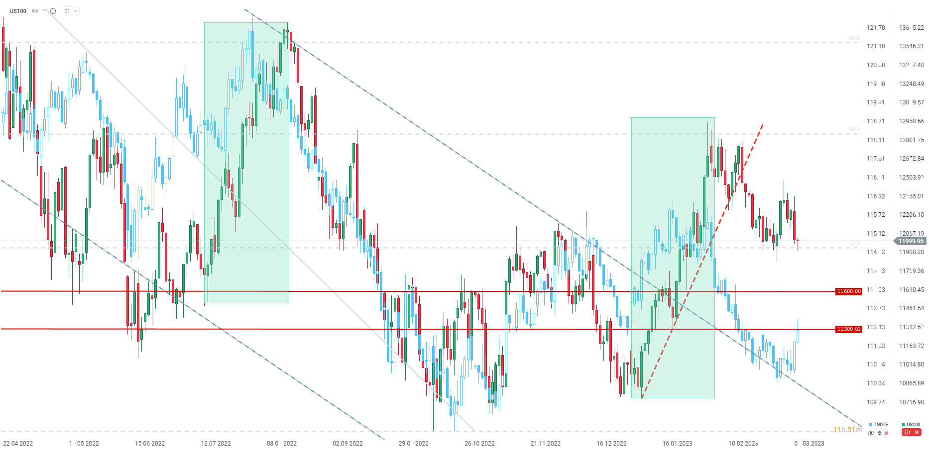 US100 tenterà di difendere il 23,6% del ritracciamento e risalire sopra i 12.000 punti. In caso contrario, l'indice potrebbe scendere fino a 11.600-11.700 punti, il che aiuterebbe a chiudere la divergenza con TNOTE.