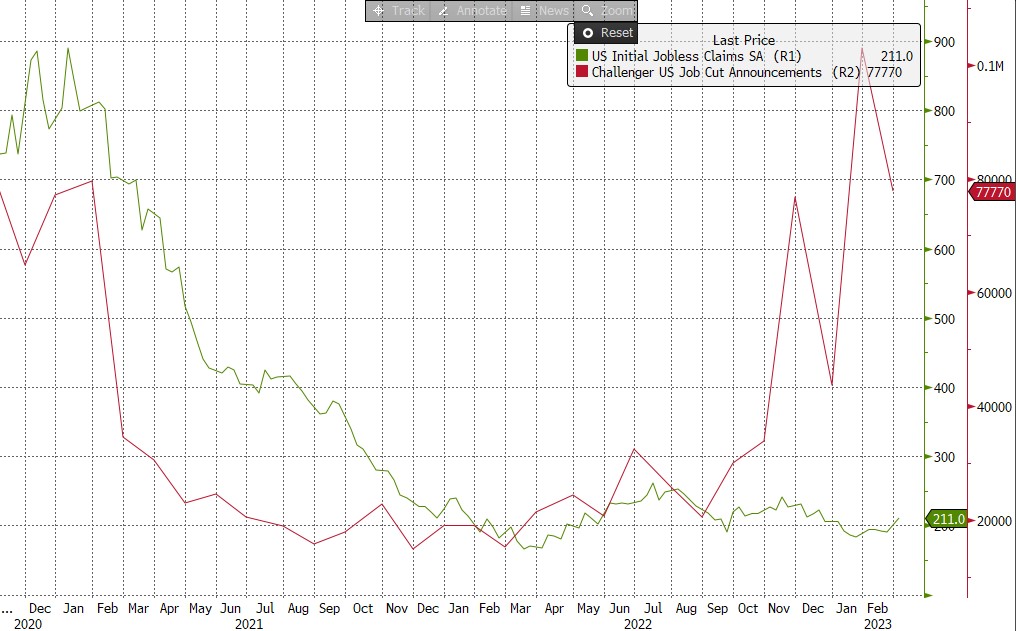 Per quanto riguarda il mercato del lavoro statunitense, rimane forte e teso. I dati sulle richieste di disoccupazione che continuano a scendere sotto i 200.000 lo dimostrano, così come i sottoindici sull'occupazione nei dati ISM. Inoltre, i dati JOLTS continuano a indicare un'abbondanza di posizioni aperte. Powell è stato accusato durante le recenti udienze al Congresso di poter innescare un picco di disoccupazione mentre tenta di ottenere il controllo sull'inflazione. Tuttavia, Powell vede la possibilità di ridurre l'inflazione mantenendo una bassa disoccupazione. D'altra parte, quando diamo uno sguardo ai dettagli del rapporto Challenger, possiamo vedere che i licenziamenti programmati sono in aumento.