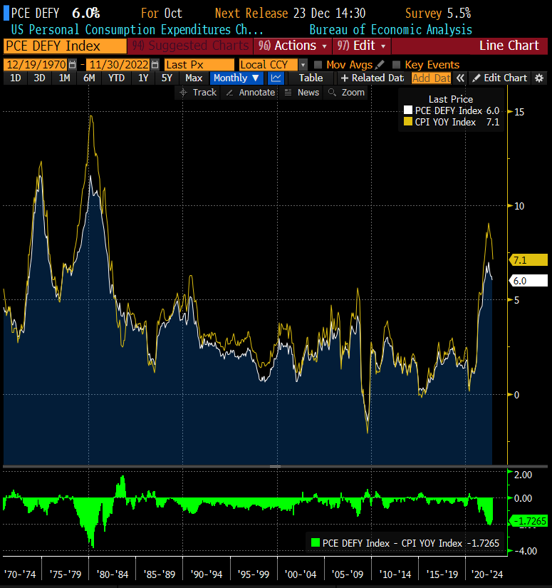 La differenza tra inflazione PCE e CPI è la più elevata dagli anni '80. Se l'inflazione PCE non dovesse rallentare come quella CPI, potrebbero aumentare le aspettative di una maggiore stretta da parte della Fed. Nonostante la previsione della stessa Fed di tassi superiori al 5% l'anno prossimo, il mercato vede attualmente un picco più vicino al 4,9%. Fonte: Bloomber