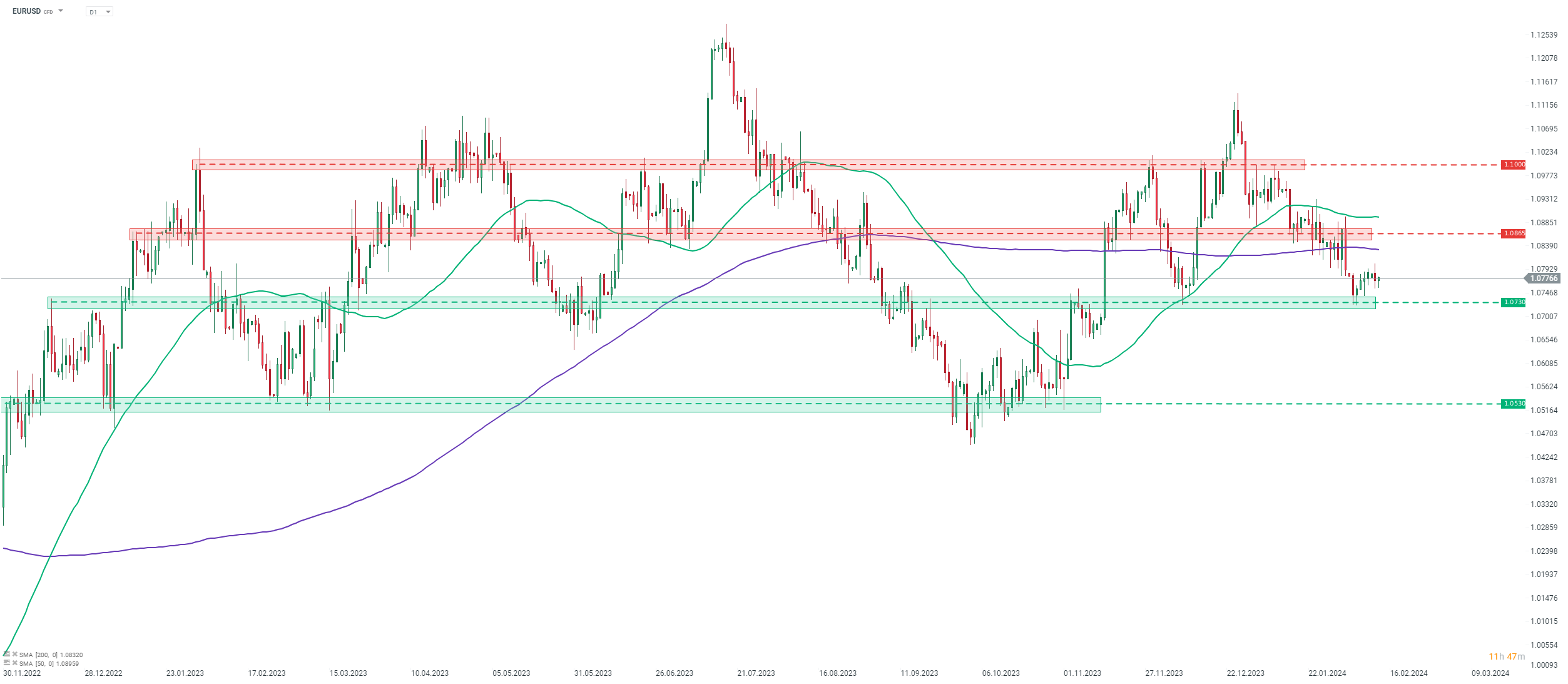La scorsa settimana la coppia EUR/USD ha nuovamente testato i minimi di inizio dicembre 2023 nell’area 1,0730, ma non è riuscita a superarla. La coppia si è ripresa leggermente, ma il rimbalzo ha iniziato a perdere slancio. Un indice dei prezzi al consumo inferiore alle attese oggi potrebbe fornire una spinta e aiutare a riprendere il movimento di ripresa. In uno scenario del genere, i trader si concentreranno sulla media mobile di 200 sessioni (linea viola, area 1.0830) e sulla zona di resistenza 1.0865. D'altro canto, un valore nominale pari o superiore al 3% potrebbe portare ad un altro test del supporto a 1,0730. Fonte: xStation5