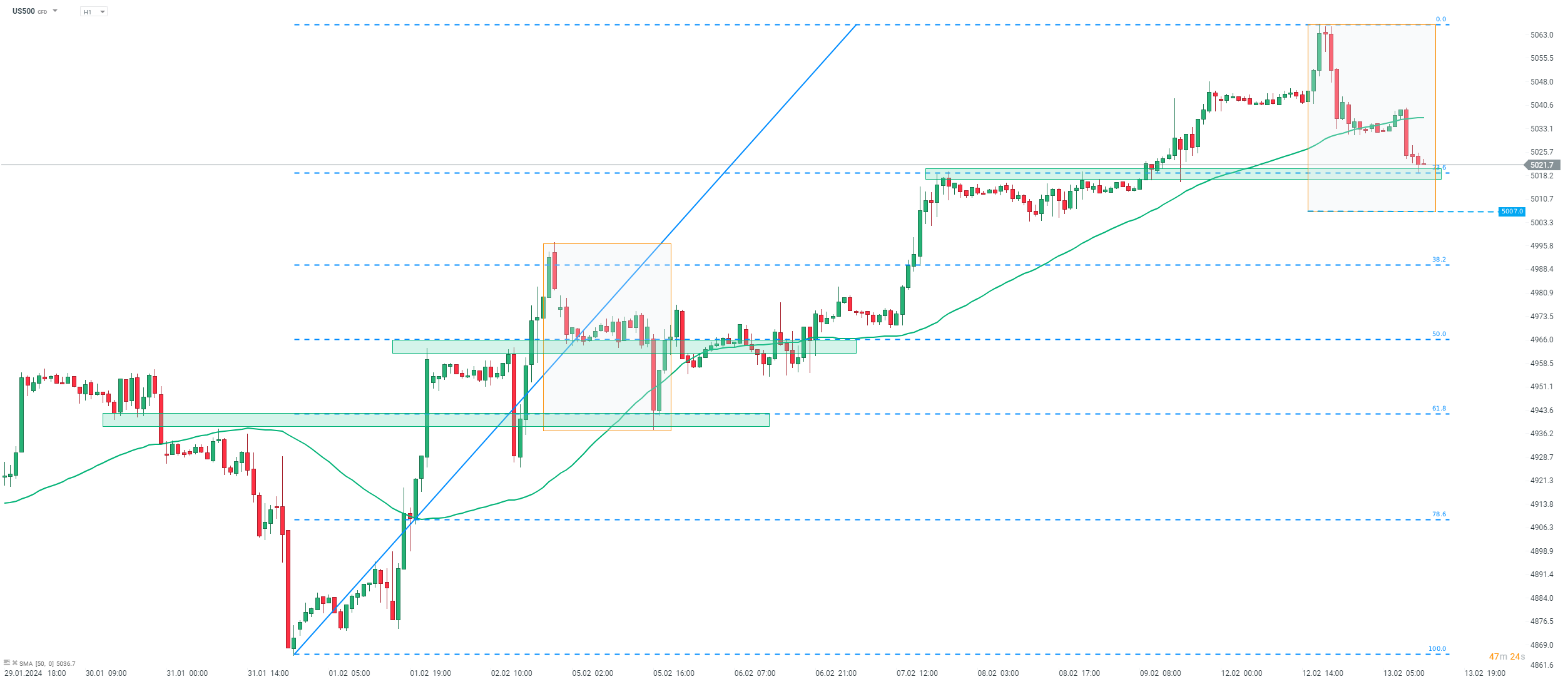La settimana scorsa i futures S&P 500 (US500) hanno superato la soglia dei 5.000 punti per la prima volta nella storia. L'indice ha continuato a salire, ma il rialzo si è fermato nell'area dei 5.066 punti ed è stata avviata una correzione. Al momento, l'indice si trova intorno al 23,6% del ritracciamento del recente impulso al rialzo. Qualora i dati sull’inflazione diventassero restrittivi (sorpresa al rialzo), l’indice potrebbe estendere il calo. In uno scenario del genere, il limite inferiore della geometria del mercato locale a 5.007 punti sarà seguito. D’altro canto, un rapporto accomodante potrebbe aiutare l’indice a risalire verso i massimi recenti. Fonte: xStation5