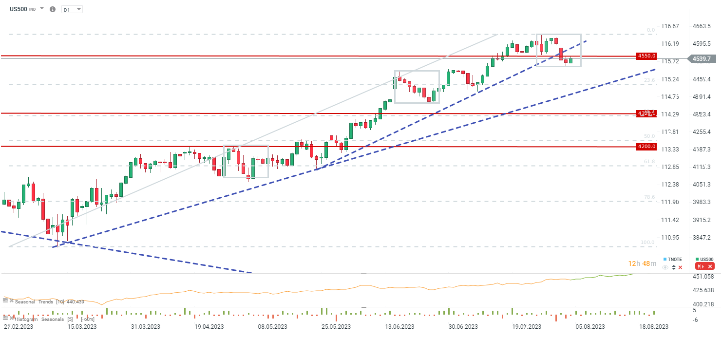L'US500 continua a essere scambiato al di sopra del limite inferiore della struttura Overbalance, segnalando che il trend rialzista in corso da marzo è ancora in atto. Se la candela giornaliera di oggi oscura il corpo e gli stoppini della candela ribassista di ieri, potrebbe essere un forte segnale rialzista per la prossima settimana. Naturalmente, un rapporto NFP molto forte con aumenti di posti di lavoro molto più alti del previsto di 200.000 potrebbe mettere sotto pressione le azioni e portare a un altro test dell'area di 4.500 punti per US500. Un movimento oltre quest'area potrebbe innescare un pullback fino al 23,6% del ritracciamento che si trova vicino alla linea di tendenza al rialzo. Fonte: xStation5