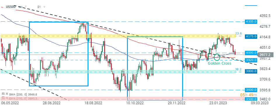 US500 ha superato il supporto psicologico a 4000 punti e si trova al livello più basso dalla fine di gennaio. Se prevale il sentimento attuale, il prossimo supporto da tenere d'occhio si trova a 3920 punti, contrassegnato dalle precedenti reazioni e 200 SMA (linea rossa). Fonte: xStation5