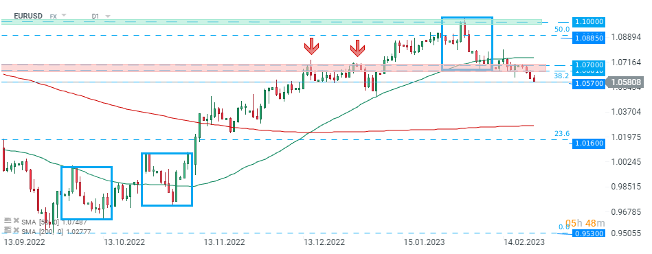La coppia EURUSUD estende il movimento al ribasso e sta attualmente testando il supporto a 1,0570, che coincide con il 38,2% del ritracciamento di Fibonacci dell'ondata al ribasso iniziata a maggio 2021. Un movimento oltre potrebbe fornire una spinta ulteriore. Fonte: xStation5