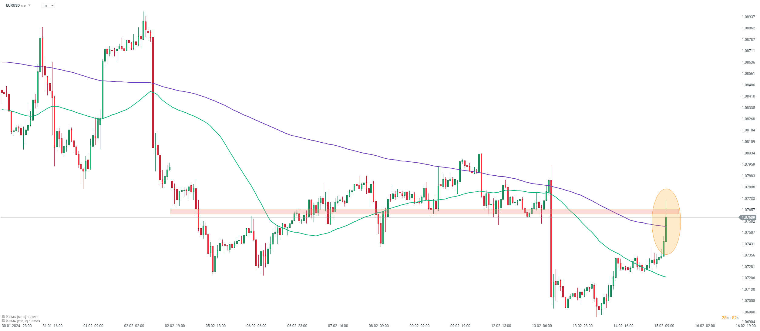 L'EUR/USD è salito in seguito al deludente rapporto sulle vendite al dettaglio negli Stati Uniti e ha superato la media mobile a 200 ore (linea viola). Fonte: xStation5