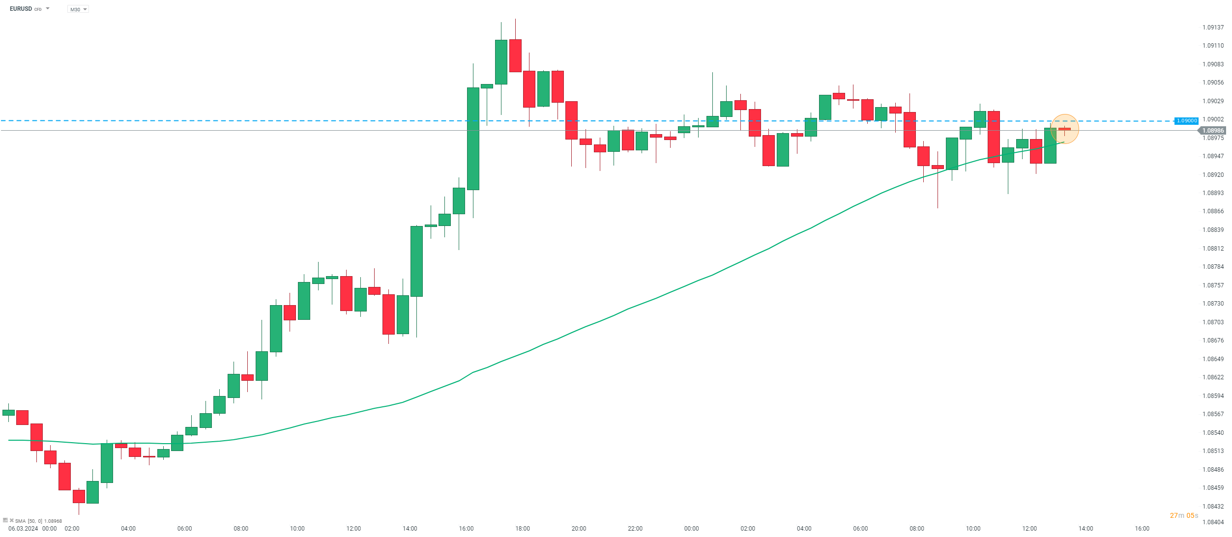 L'EUR/USD continua a essere scambiato leggermente al di sotto della soglia di 1,09 dopo la pubblicazione del rapporto Challenger statunitense di febbraio. Fonte: xStation5