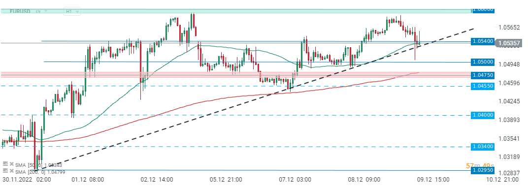 Inizialmente la coppia di valute EURUSD è salita dopo la pubblicazione, tuttavia la situazione è cambiata rapidamente e la coppia sta testando il supporto locale a 1,0540. Fonte: xStation5