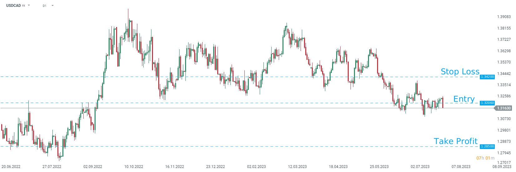 HSBC consiglia di aprire una posizione Short su USDCAD al prezzo di mercato con un obiettivo di 1,2850 e un ordine di stop loss collocato a 1,3420. Fonte: xStation5