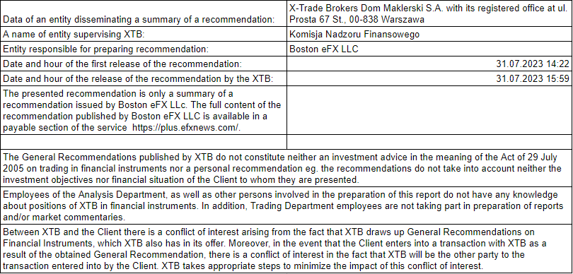 Questo materiale è una comunicazione di marketing ai sensi dell'Art. 24, paragrafo 3, della direttiva 2014/65 / UE del Parlamento europeo e del Consiglio, del 15 maggio 2014, relativa ai mercati degli strumenti finanziari e che modifica la direttiva 2002/92 / CE e la direttiva 2011/61 / UE (MiFID II). La comunicazione di marketing non è una raccomandazione di investimento o informazioni che raccomandano o suggeriscono una strategia di investimento ai sensi del regolamento (UE) n. 596/2014 del Parlamento europeo e del Consiglio, del 16 aprile 2014, relativo agli abusi di mercato (regolamento sugli abusi di mercato) e che abroga la direttiva 2003/6 / CE del Parlamento europeo e del Consiglio e direttive della Commissione 2003/124 / CE, 2003/125 / CE e 2004/72 / CE e regolamento delegato (UE) 2016/958 della Commissione, del 9 marzo 2016, che integra il regolamento UE) n. 596/2014 del Parlamento europeo e del Consiglio per quanto riguarda le norme tecniche di regolamentazione per le disposizioni tecniche per la presentazione obiettiva di raccomandazioni di investimento o altre informazioni che raccomandano o suggeriscono una strategia di investimento e per la divulgazione di particolari interessi o indicazioni di conflitti di interessi o qualsiasi altra consulenza, anche nell'ambito della consulenza sugli investimenti, ai sensi della legge sugli strumenti finanziari del 29 luglio 2005 (ad es. Journal of Laws 2019, voce 875, come modificata). La comunicazione di marketing è preparata con la massima diligenza, obiettività, presenta i fatti noti all'autore alla data di preparazione ed è priva di elementi di valutazione. La comunicazione di marketing viene preparata senza considerare le esigenze del cliente, la sua situazione finanziaria individuale e non presenta alcuna strategia di investimento in alcun modo. La comunicazione di marketing non costituisce un'offerta di vendita, offerta, abbonamento, invito all'acquisto, pubblicità o promozione di strumenti finanziari. XTB S.A. non è responsabile per eventuali azioni o omissioni del cliente, in particolare per l'acquisizione o la cessione di strumenti finanziari. XTB non si assume alcuna responsabilità per qualsiasi perdita o danno, anche senza limitazione, eventuali perdite, che possono insorgere direttamente o indirettamente, intrapresa sulla base delle informazioni contenute in questa comunicazione di marketing. Nel caso in cui la comunicazione di marketing contenga informazioni su eventuali risultati relativi agli strumenti finanziari ivi indicati, questi non costituiscono alcuna garanzia o previsione relativa ai risultati futuri. Le prestazioni passate non sono necessariamente indicative dei risultati futuri, e chiunque agisca su queste informazioni lo fa interamente a proprio rischio.