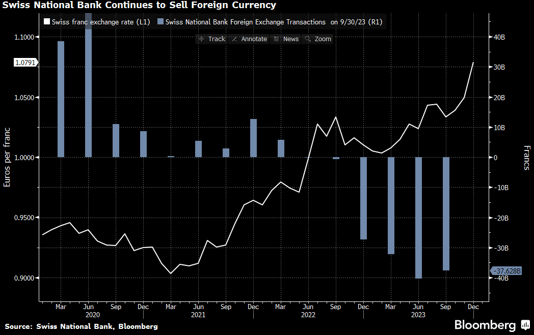 - Nel terzo trimestre la Banca nazionale svizzera (BNS) ha venduto valuta estera per un valore di 44,73 miliardi di dollari. Si tratterà probabilmente dell'ultima grande ondata di vendite da qualche tempo, dopo che l'inflazione svizzera è tornata nella fascia obiettivo dello 0-2%.