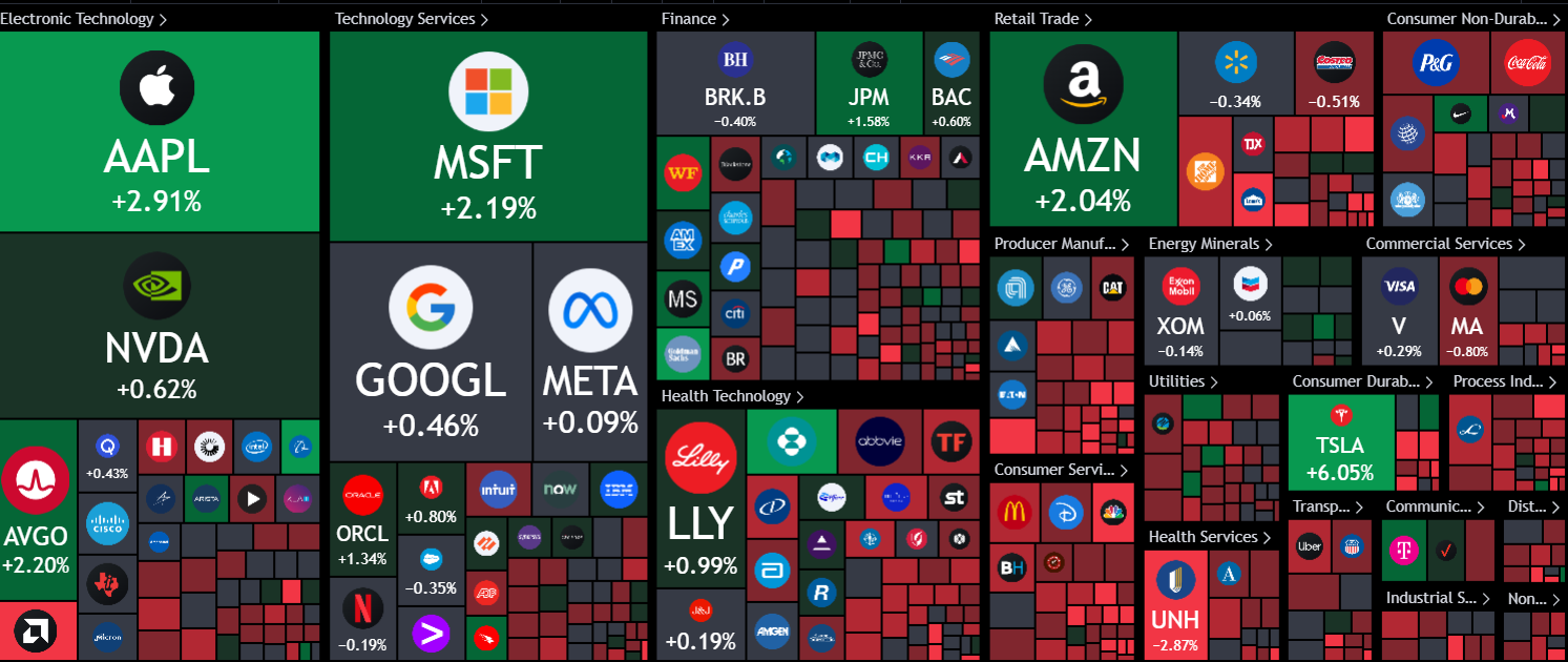 Mercato azionario che fa molta fatica a scendere e lo vediamo con gli indici delle Big Tech, ossia Nasdaq e S&P500. Nella heatmap del mercato, dove abbiamo una panoramica visiva di come il mercato é composto e di come siano stati i rendimenti giornalieri, possiamo notare come i titoli a "non-alta capitalizzazione" siano in linea di massima negativi o poco rialzisti, mentre vanno in tutt'altra direzione i titoli big tech, i titoli con la piú alta capitalizzazione al mondo. Nella sostanza il mercato azionario attuale é fatto da big tech, il resto inizia a non contare piú e questo é un problema soprattutto se mettiamo in relazione questo andamento con quelle che sono le considerazioni che si possono fare sul mercato azionario in generale. Pensiamo al fatto che il Russell2000, l'indice della small cap americane ha chiuso il mese di giugno al di sotto dei massimi di dicembre 2023, in pratica é un indice fermo che non riesce a trovare spunti rialzisti, mentre a salire sono solamente le big tech che stanno creando delle distorsioni sull'attuale lettura del mercato. Per fare un esempio, quando parliamo di azionario Usa, non stiamo parlando del mercato azionario nel suo complesso, bensí di una manciata di titoli che porta al traino tutto il resto solamente per quanto riguarda il rendimento finale dell'indice. Di fatto quando salgono le big tech, il resto rimane indietro.