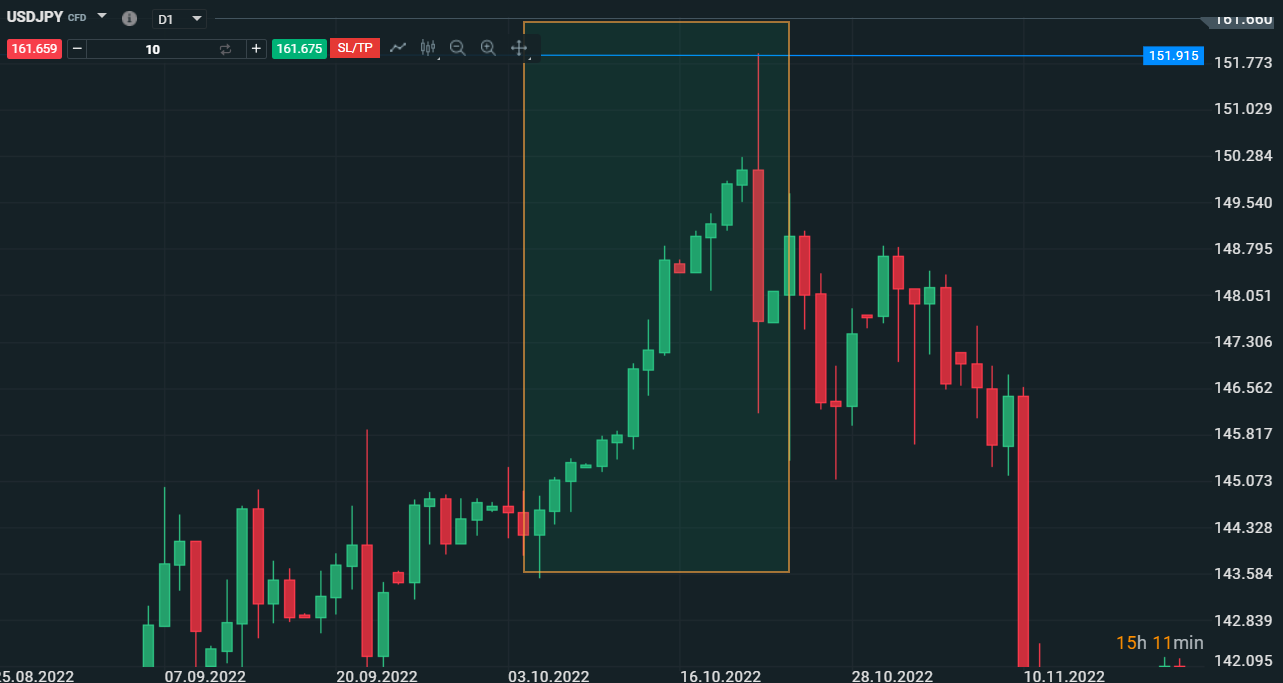 La dinamica dei prezzi del 2022 di UsdJpy prima del secondo intervento - Fonte: XStation