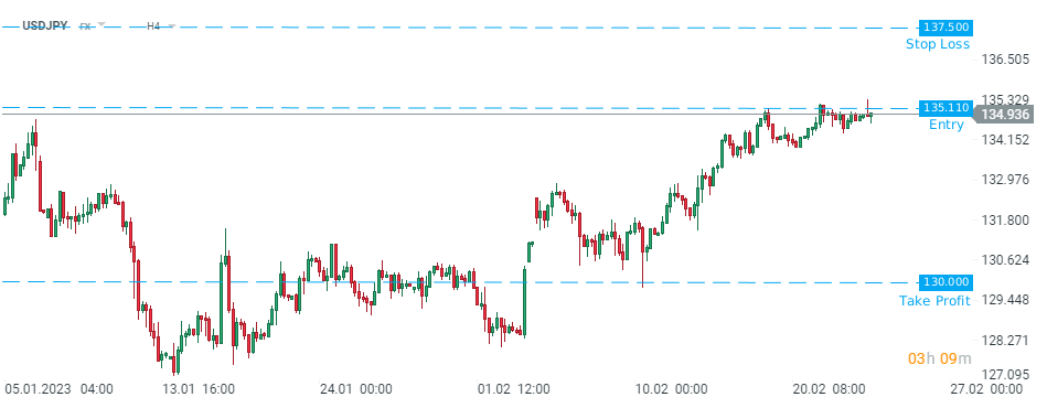 Danske Bank consiglia di aprire una posizione Short su USDJPY a 135,11 con un obiettivo di 130,00 e un ordine di stop loss a 137,50. Fonte: xStation5