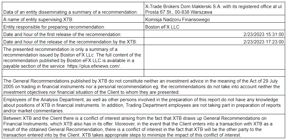Questo materiale è una comunicazione di marketing ai sensi dell'Art. 24, paragrafo 3, della direttiva 2014/65 / UE del Parlamento europeo e del Consiglio, del 15 maggio 2014, relativa ai mercati degli strumenti finanziari e che modifica la direttiva 2002/92 / CE e la direttiva 2011/61 / UE (MiFID II). La comunicazione di marketing non è una raccomandazione di investimento o informazioni che raccomandano o suggeriscono una strategia di investimento ai sensi del regolamento (UE) n. 596/2014 del Parlamento europeo e del Consiglio, del 16 aprile 2014, relativo agli abusi di mercato (regolamento sugli abusi di mercato) e che abroga la direttiva 2003/6 / CE del Parlamento europeo e del Consiglio e direttive della Commissione 2003/124 / CE, 2003/125 / CE e 2004/72 / CE e regolamento delegato (UE) 2016/958 della Commissione, del 9 marzo 2016, che integra il regolamento UE) n. 596/2014 del Parlamento europeo e del Consiglio per quanto riguarda le norme tecniche di regolamentazione per le disposizioni tecniche per la presentazione obiettiva di raccomandazioni di investimento o altre informazioni che raccomandano o suggeriscono una strategia di investimento e per la divulgazione di particolari interessi o indicazioni di conflitti di interessi o qualsiasi altra consulenza, anche nell'ambito della consulenza sugli investimenti, ai sensi della legge sugli strumenti finanziari del 29 luglio 2005 (ad es. Journal of Laws 2019, voce 875, come modificata). La comunicazione di marketing è preparata con la massima diligenza, obiettività, presenta i fatti noti all'autore alla data di preparazione ed è priva di elementi di valutazione. La comunicazione di marketing viene preparata senza considerare le esigenze del cliente, la sua situazione finanziaria individuale e non presenta alcuna strategia di investimento in alcun modo. La comunicazione di marketing non costituisce un'offerta di vendita, offerta, abbonamento, invito all'acquisto, pubblicità o promozione di strumenti finanziari. XTB S.A. non è responsabile per eventuali azioni o omissioni del cliente, in particolare per l'acquisizione o la cessione di strumenti finanziari. XTB non si assume alcuna responsabilità per qualsiasi perdita o danno, anche senza limitazione, eventuali perdite, che possono insorgere direttamente o indirettamente, intrapresa sulla base delle informazioni contenute in questa comunicazione di marketing. Nel caso in cui la comunicazione di marketing contenga informazioni su eventuali risultati relativi agli strumenti finanziari ivi indicati, questi non costituiscono alcuna garanzia o previsione relativa ai risultati futuri. Le prestazioni passate non sono necessariamente indicative dei risultati futuri, e chiunque agisca su queste informazioni lo fa interamente a proprio rischio.