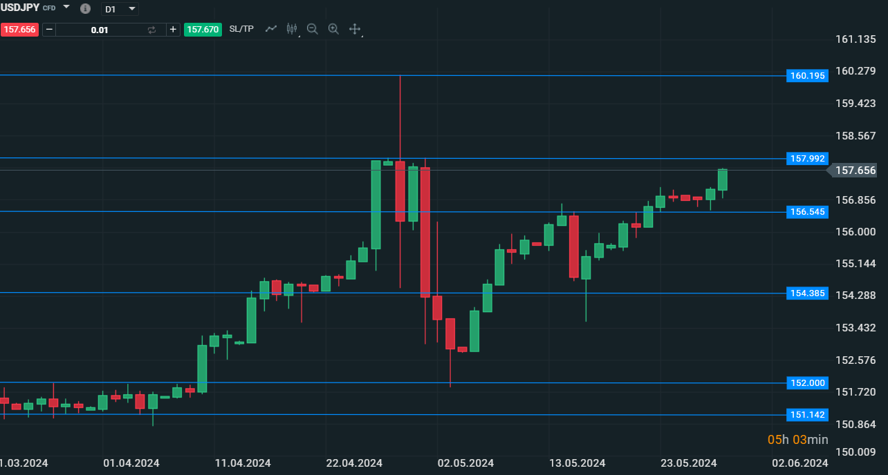 UsdJpy a ridosso dei 158 su base daily - Fonte:XStationMERCATI USA IN RIPRESA MA NEGATIVI