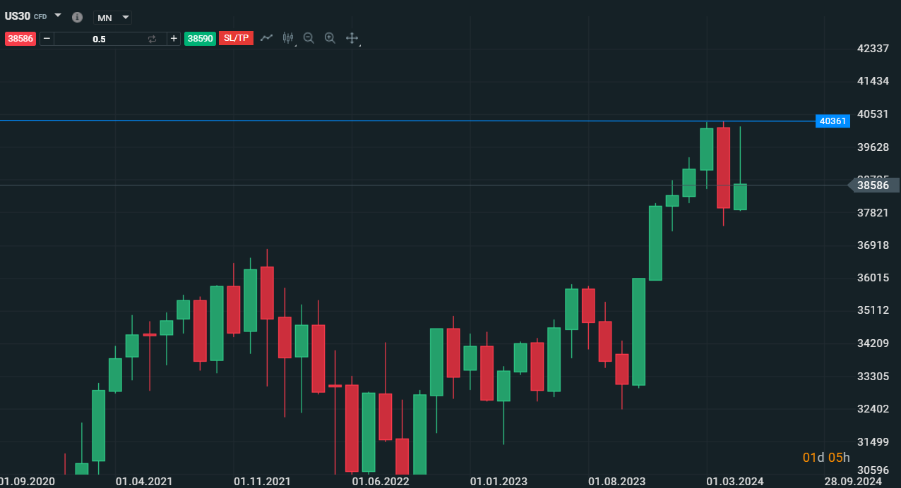 Dow Jones grafico mensile e la shadow pronunciata del mese di maggio dai massimi - Fonte:XStation