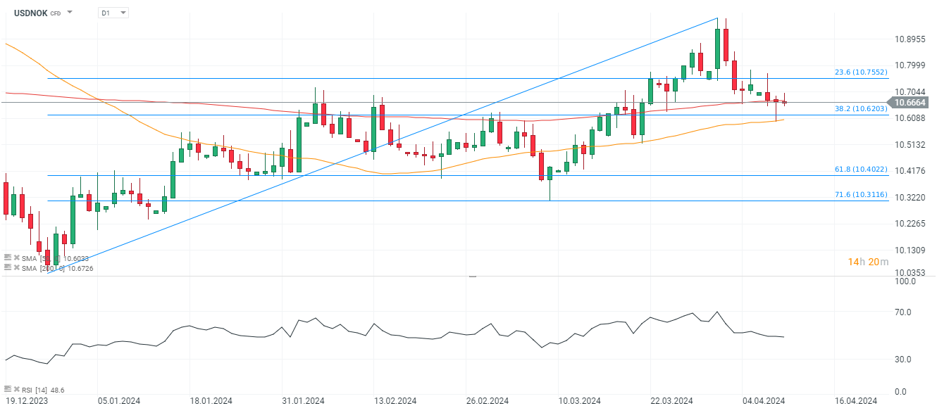 Oggi la lettura dell'indice dei prezzi al consumo suggerisce una certa pressione nell'economia norvegese ma, nonostante ciò, il rally del petrolio sta sostenendo la NOK. Oggi possiamo vedere che, nonostante la lettura dell'IPC, la coppia è di nuovo al di sotto del livello 10,67, dove possiamo vedere la zona SMA200 (linea rossa). Ciò potrebbe suggerire una pressione sulla struttura del mercato di “inversione di tendenza”, soprattutto se il rally del petrolio persisterà. Oggi la lettura dell’indice dei prezzi al consumo statunitense potrebbe aumentare la volatilità sull’USDNOK con dati inferiori alle attese che alimentano un possibile slancio della NOK e esercitano un’ulteriore pressione al ribasso sulla coppia con il dollaro USA.