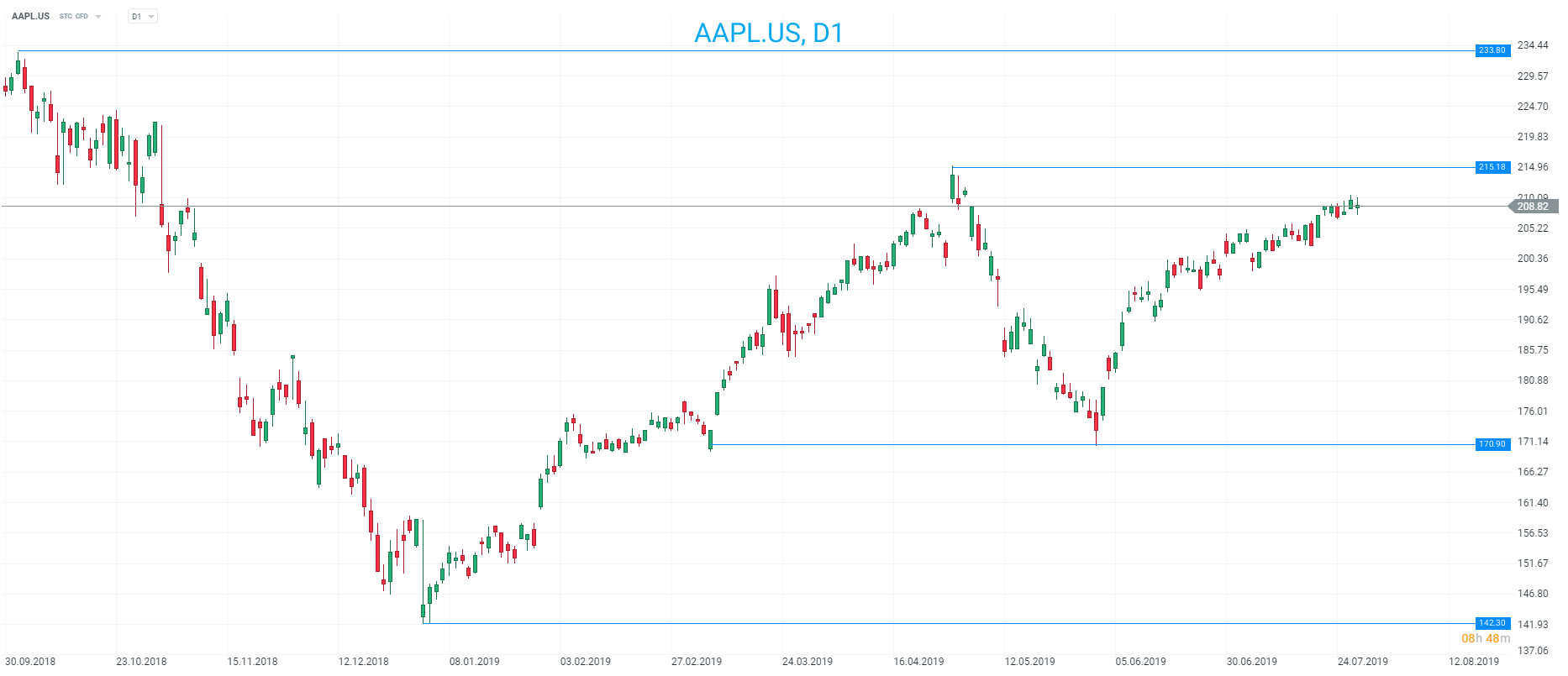 Le azioni Apple sono tradate in rialzo nel mercato primario con il titolo che dovrebbe iniziare ai massimi livelli dallo scorso novembre. Fonte: xStation