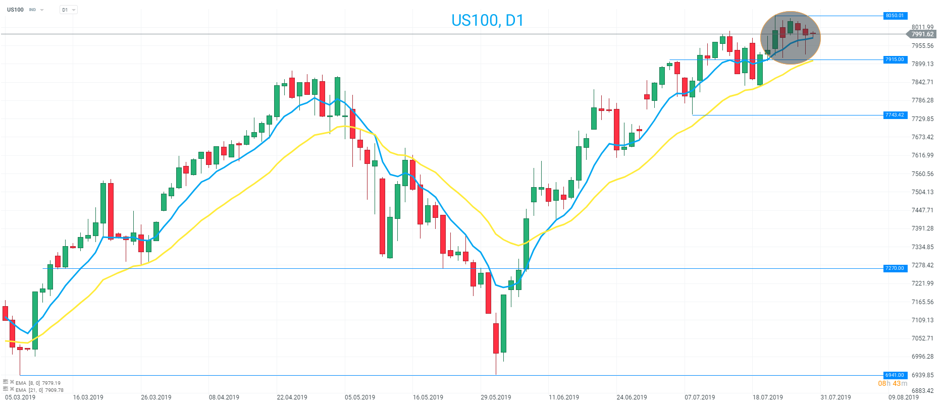 Il NASDAQ rimane vicino al livello più alto mai registrato. I ribassi nelle ultime sessioni sono state acquistate come mostrato dagli stoppini sotto le candele D1 e una pausa sopra 8050 aiuterebbe un altro potenziale rialzo in futuro. Fonte: xStation