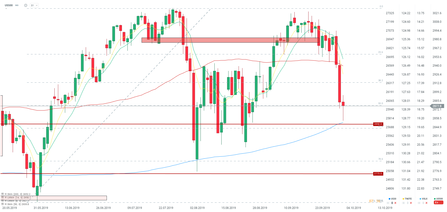 US500 sta rimbalzando da un'importante zona di supporto a 2850 punti, 200DMA(media mobile spostata) e il 61.8% del ritracciamento Fibonacci. Fonte: xStation5