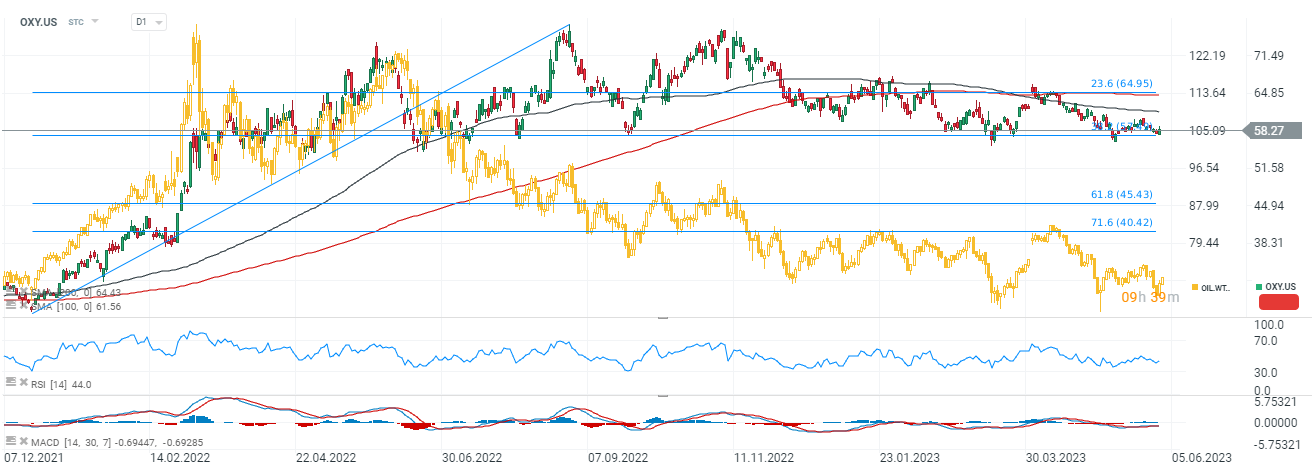 Il prezzo al barile di greggio Texas WTI (grafico giallo) è sceso dai 130 dollari del suo picco a 70 dollari negli ultimi giorni. Allo stesso tempo, le azioni Occidental sono rimaste meno volatili e sono scese da $ 78 a $ 58, dove Buffett è attivo. Fonte: xStation5