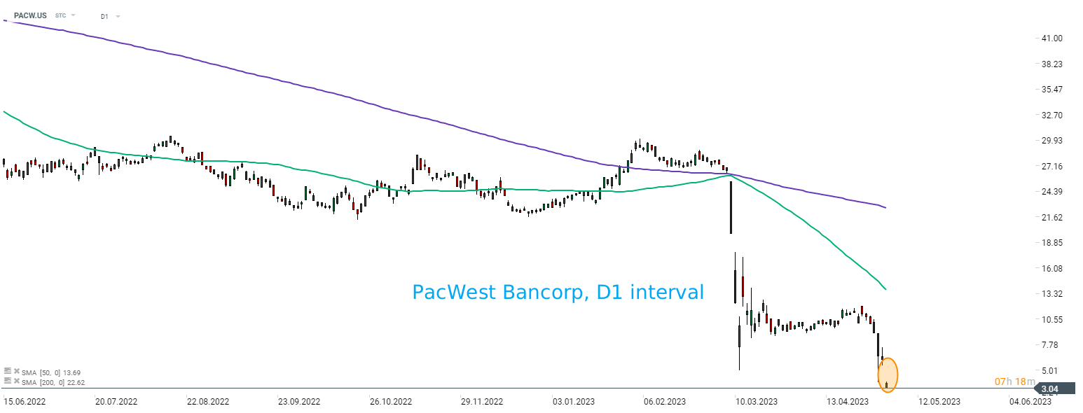 PacWest Bancorp (PACW.US) è in ribasso di circa il 50% dopo che la società ha confermato ieri che sta esplorando una potenziale vendita. Fonte: xStation5