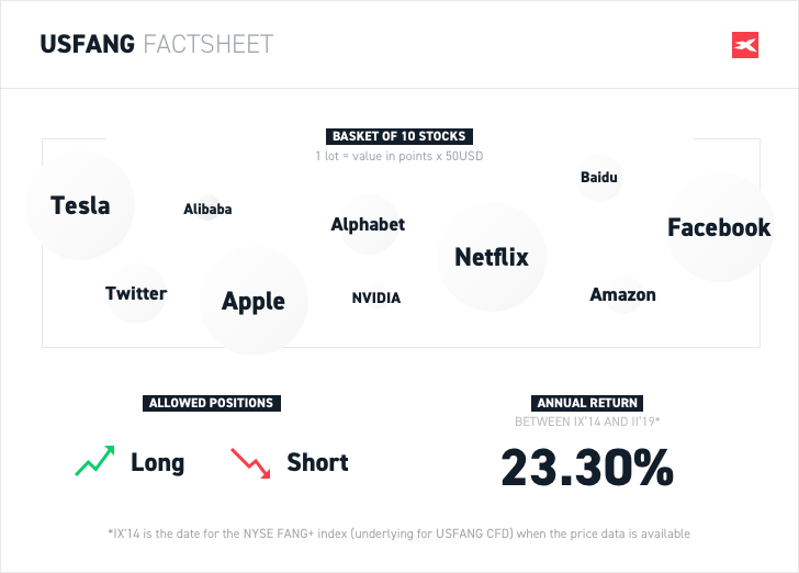 L’ Indice CFD ha le due caratteristiche principali: leva e scala. Se vuoi investire in 10 titoli tecnologici (Alibaba, Alphabet, Amazon, Apple, Baidu, Facebook, Netflix, NVIDIA, Tesla e Twitter) avrai bisogno di un bel po' di capitale. Con CFD USFANG non solo hai tutto incluso in un indice, ma avrai solo bisogno di un deposito del 10% per prendere posizione. La scala ti consente di ottenere la posizione più ampia che desideri. Un lotto rappresenta il valore del punto di $50, quindi se l'indice è a 2600 punti il valore sarebbe $130000. Tuttavia, se vuoi che la tua posizione sia $ 50000, puoi prendere 0,38 lotti. Per fare ciò, hai solo bisogno di un deposito di $ 4940. Pertanto, USFANG è un ottimo modo per investire in titoli tecnologici utilizzando un solo strumento.