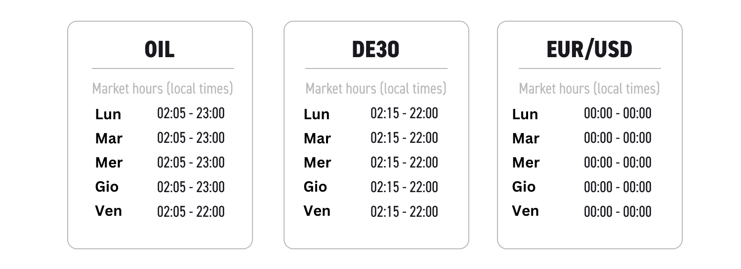 Nel caso di strumenti come futures su indici o futures su materie prime, gli orari di apertura dipendono dalla liquidità e dagli orari di negoziazione dello strumento sottostante, ad esempio quotato sul CME.