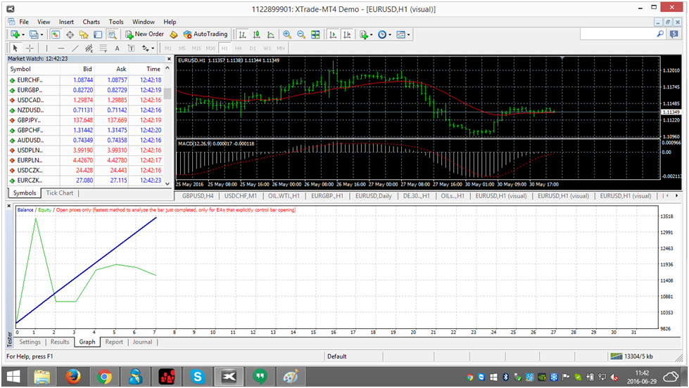 Una volta aperta la finestra del Tester Strategia, puoi scegliere la strategia che ti interessa e fornire degli altri parametri connessi con il processo del test come il nome del simbolo ed il periodo per il backtest. Una volta impostati tutti i parametri, puoi iniziare il processo di backtesting schiacciando “Start” e attendendo i risultati. I risultati possono venir analizzati in tre etichette separate:
