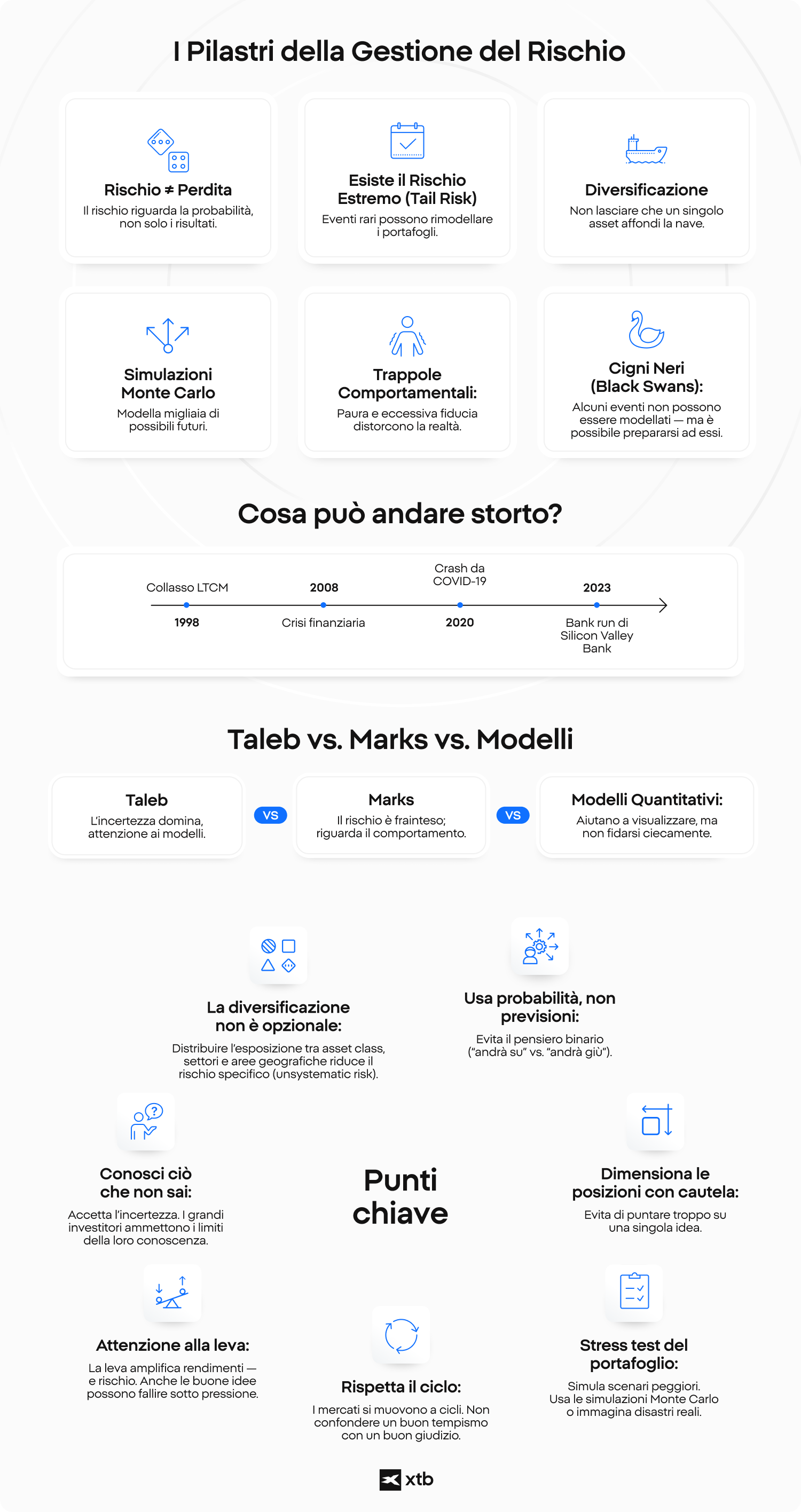 Gestire il rischio è una delle competenze più importanti per ogni investitore. Non si tratta di eliminarlo completamente, ma di riconoscerlo, misurarlo e affrontarlo in modo consapevole. Per aiutarti a orientarti nel complesso mondo degli investimenti, di seguito elenchiamo e analizziamo i sette principi fondamentali della gestione del rischio, strumenti pratici e strategie che i grandi investitori utilizzano per proteggere il portafoglio e massimizzare le opportunità.
