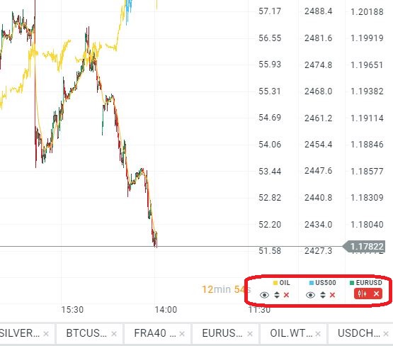 Con xStation 5, puoi inserire 5 strumenti su un grafico. Ciò viene fatto facilmente con l’icona “Compara” posta sull’asse verticale del grafico: