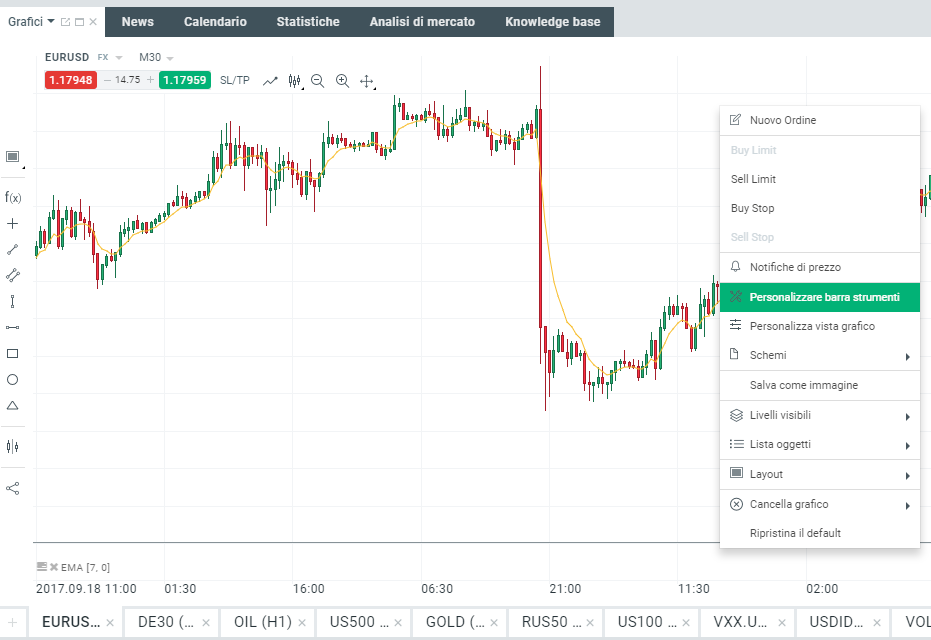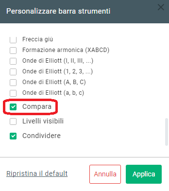 Se non vedi l’icona “Compara” sulla tua asse, clicca allora col tasto destro su qualsiasi grafico e scegli “Personalizza barra degli strumenti”.