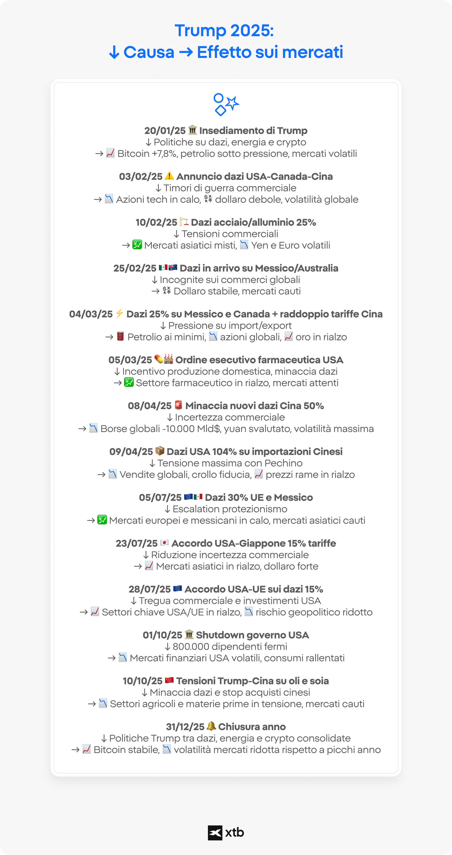 Analizzando il 2025 a posteriori, emerge con chiarezza come la politica sia tornata a essere un motore centrale dei mercati finanziari. Le decisioni e le dichiarazioni di Trump hanno dimostrato che date ed eventi specifici possono tradursi rapidamente in movimenti di prezzo, spesso indipendenti dai fondamentali di lungo periodo.