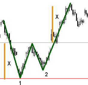 Alla stessa maniera del doppio massimo, il doppio minimo anche definisce un target. Dopo la rottura del livello di resistenza il mercato dovrebbe guadagnare in valore di una distanza uguale alla distanza misurata dalla prima valle fino al picco tra le due valli (distanza X dalla schermata mostrata sopra).
