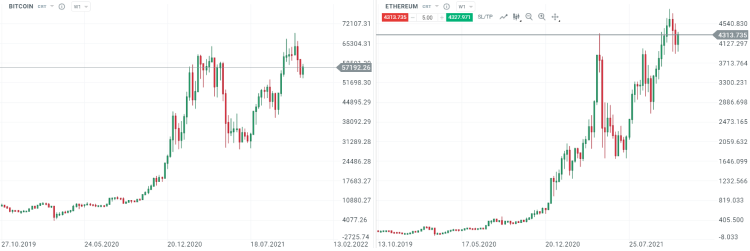 XStation 5 offre una vasta gamma di strumenti di analisi tecnica. Confrontando i grafici di Bitcoin (a sinistra) ed Ethereum (a destra), la correlazione tra le due criptovalute diventa chiaramente visibile anche a colpo d'occhio. Tuttavia, l'anno 2021 ha visto un aumento molto più alto nel grafico di Ethereum che nel caso di Bitcoin. Si prega di notare che le informazioni e gli studi basati su dati o risultati storici non garantiscono profitti in futuro.