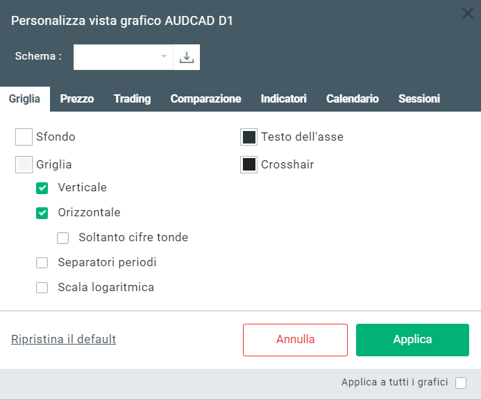Inoltre, xStation 5 ti consente di personalizzare facilmente l’aspetto dei grafici per le tue esigenze. Devi semplicemente cliccare col tasto destro sul grafico  e selezionare “Personalizza vista grafico”. Comparirà una nuova finestra e potrai così gestire e personalizzare pienamente i tuoi grafici secondo le tue preferenze.