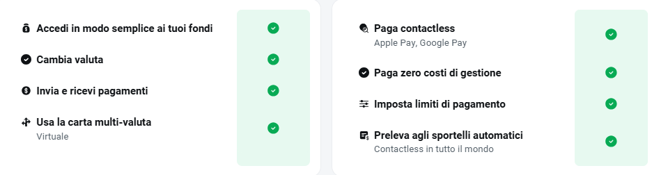 Disponibilità della Carta: Accedi alla tua carta attiva in qualsiasi momento, a meno che non sia bloccata o eliminata manualmente. Ecco le principali funzionalità: