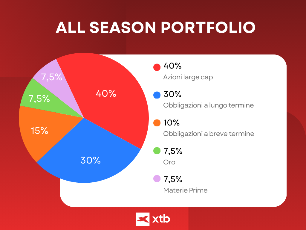 L’All Season Portfolio, sviluppato da Ray Dalio, è progettato per performare in ogni fase del ciclo economico. La struttura classica prevede: 30% azioni, 40% obbligazioni a lungo termine, 15% obbligazioni a breve termine, 7,5% oro e 7,5% materie prime. L’obiettivo è mantenere una stabilità robusta, riducendo la volatilità complessiva e proteggendo il portafoglio sia dall’inflazione che dalla deflazione. Le azioni offrono crescita, le obbligazioni lunghe e brevi mitigano i rischi legati ai tassi d’interesse, mentre oro e materie prime aggiungono protezione contro eventi economici imprevisti.
